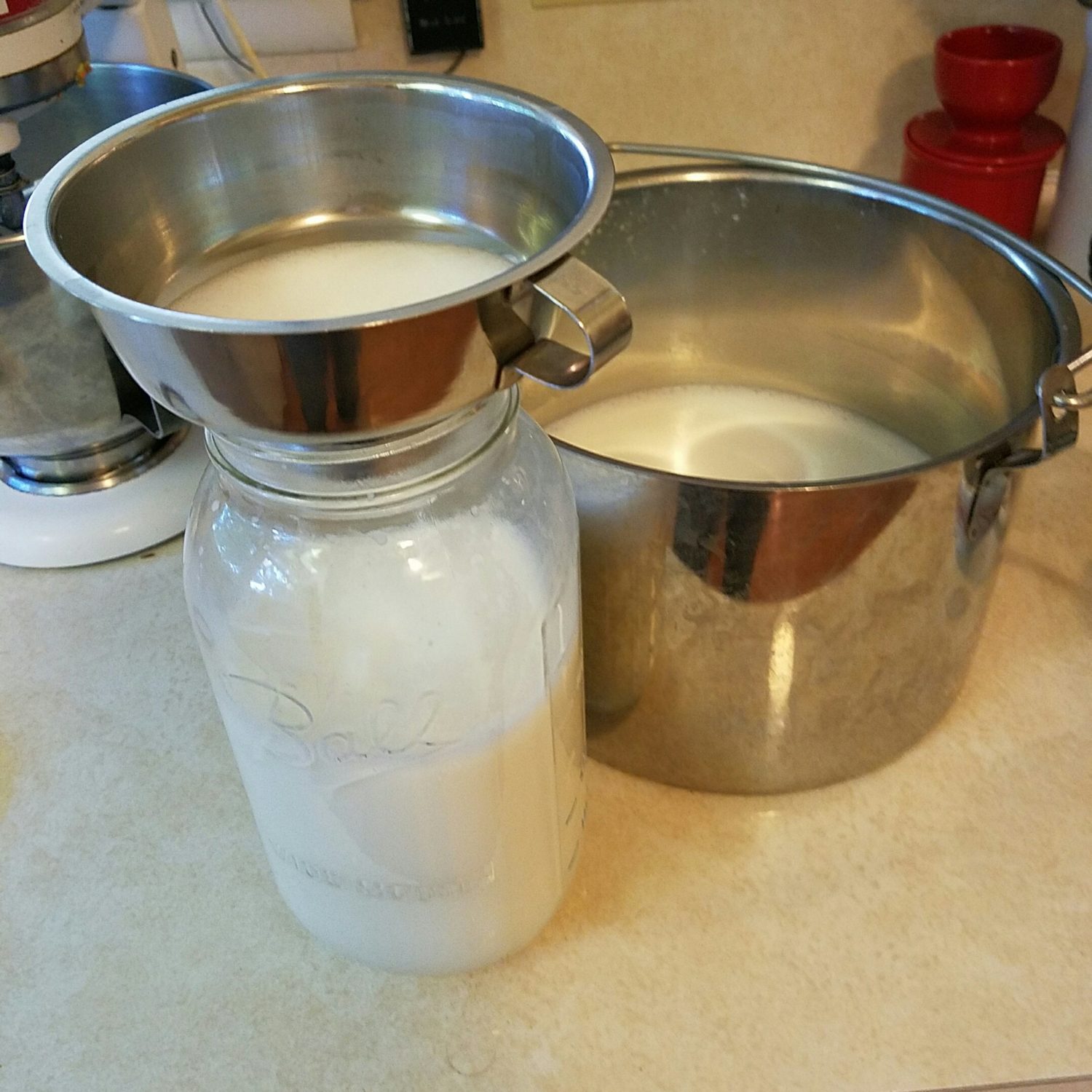 Goat milk yogurt ready to culture–a perfect way to use extra milk and preserve a wholesome source of dairy for winter.